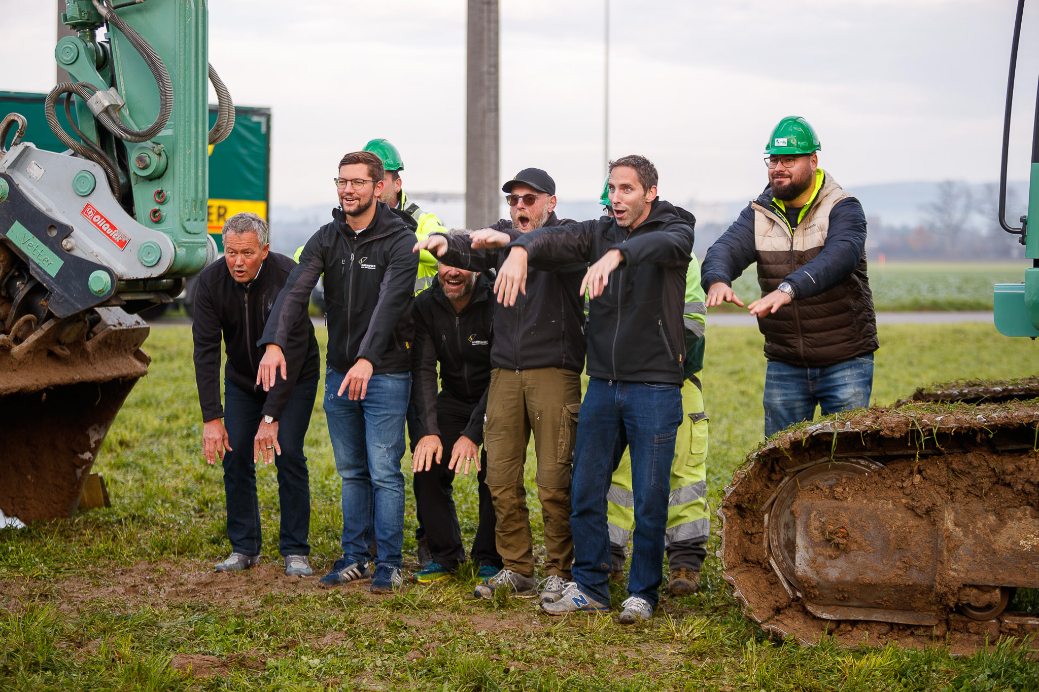 Und so liessen sich Geschäftsleitung und Mitarbeitende für die obligaten Fotos ablichten, genossen einen gemeinsamen Znüni und nutzen die Chance, für einmal selbst ein grosses Baggergerät zu bedienen. Natürlich haben wir für euch die besten Momente festgehalten…