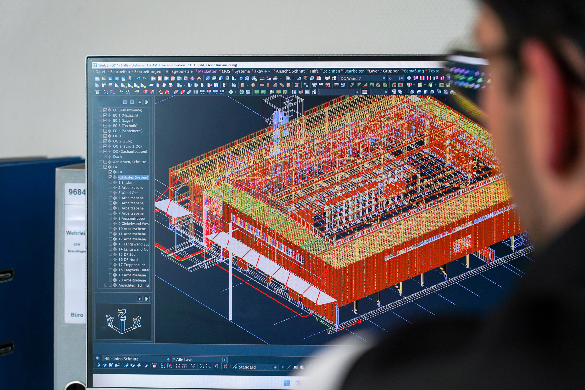 Mit der Digitalisierung hat sich auch die Arbeit der Bornhauser AG weiterentwickelt. Früher zeichneten Zimmerleute Wände und Dachstühle noch in Originalgrösse auf und montierten diese anschliessend direkt vor Ort. Heute sind Computer und CAD-Programme (Computer-Aided-Design) auch im Holzbau nicht mehr wegzudenken. Vor allem im Elementbau mit Holz macht die digitale Planung und Konstruktionsarbeit einen wichtigen und grossen Teil der Arbeit aus.